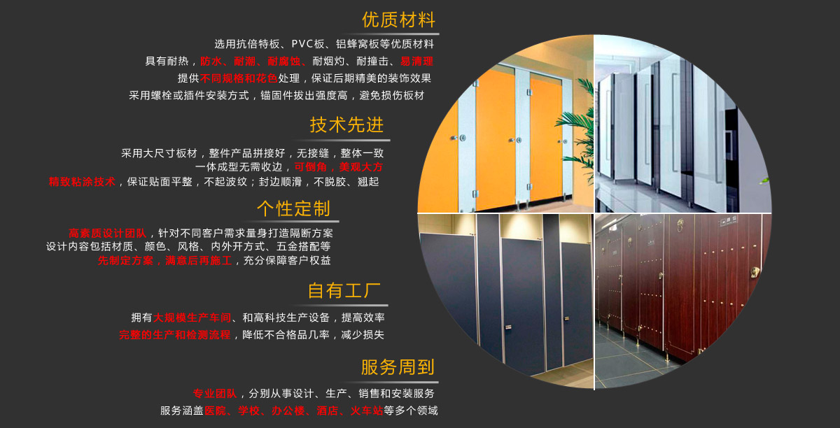本公司專(zhuān)業(yè)生產(chǎn)、制作衛(wèi)生間隔斷、儲(chǔ)物柜、等系列產(chǎn)品及相關(guān)配件的研發(fā)。產(chǎn)品投放市場(chǎng)以來(lái),一直秉承“以質(zhì)為先,以誠(chéng)為本”的宗旨,深得使用者認(rèn)同,并堅(jiān)持市場(chǎng)為導(dǎo)向,以需求為己任。產(chǎn)品不斷推陳出新,從防潮板到抗倍特板到金屬板、玻璃、全方位開(kāi)發(fā)多樣化的配件包括:尼龍、不銹鋼、鋅鋁合金,同時(shí)配套開(kāi)研出門(mén)邊扣件等附屬配件。力求做到舒適、高雅、簡(jiǎn)約、色彩豐富、安裝方便、牢固、耐用。 做專(zhuān)業(yè)者是我們孜孜以求的目的。 因?yàn)槲覀兩钪簩?zhuān)業(yè)決定品質(zhì)。